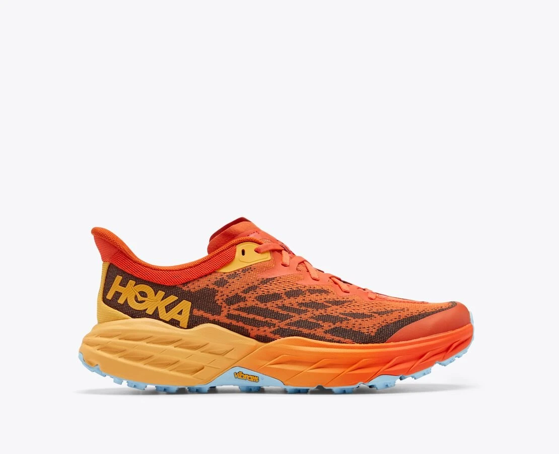 Las nuevas Zapatillas Hoka Speedgoat 5 diseñadas para senderos técnicos, con menos peso y más tracción que nunca, incluyen una nueva malla transpirable pero robusta. También lleva capas impresas en 3D que proporcionan un mayor apoyo en la zona del pie medio y una mayor sensación general de seguridad. Su ajuste es cómodo en la puntera para ofrecer una zancada más confortable.